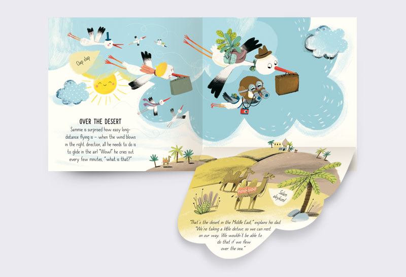 Where are they heading? At the beginning of the story Samie does not know the answer himself. In the story, you’ll follow storks on their journey to warmer places. You’ll also find out why some birds fly away during winter and when they return home. Every double page contains small brainteasers that can be solved by lifting large flaps.