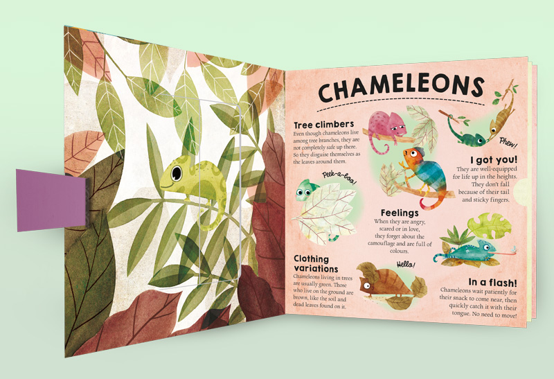 In each book five animals are hidden in their natural habitat and children can uncovered them by pulling the sliding mechanism. Moreover, they will learn more interesting facts about the camouflage of each animal. On the last page, children will have loads of fun while looking for animals that are hidden in the picture!